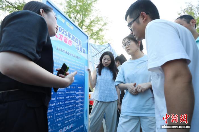 7月25日,在Amhui Faise县Champai镇的人才夜市场的一次特别招聘活动中,就业招聘人员详细介绍了其工作申请人。照片由Chen Jaiarre