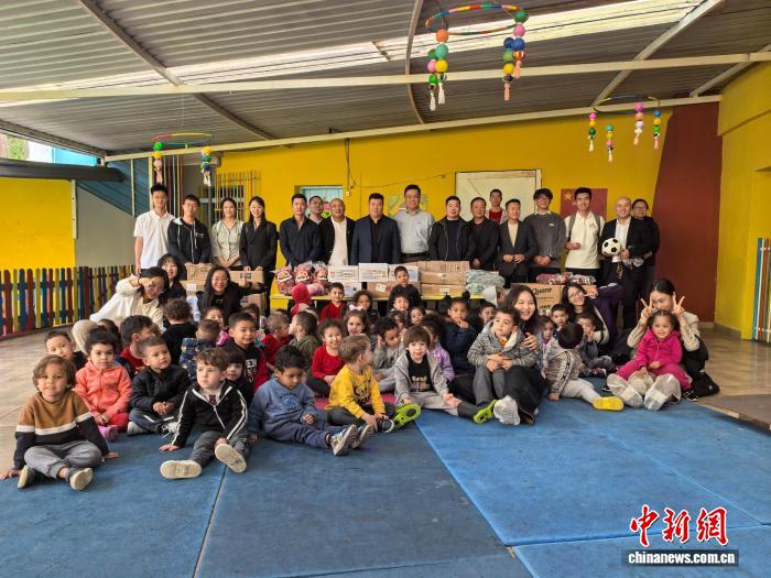 7月28日,当地时间,巴西圣保罗圣安德烈的Tinhua练习团队向“河之光”(Creschlezvale)的福利婴儿花园展示了足球。巴西慈善联合会Chintian提供的照片