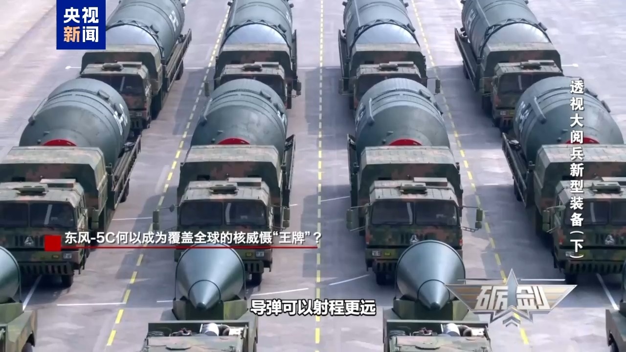 Dongfeng-5C是游行期间三辆车辆拖曳的液体燃料的洲际式液体导弹,它使用了尖锐的眼形公共汽车。