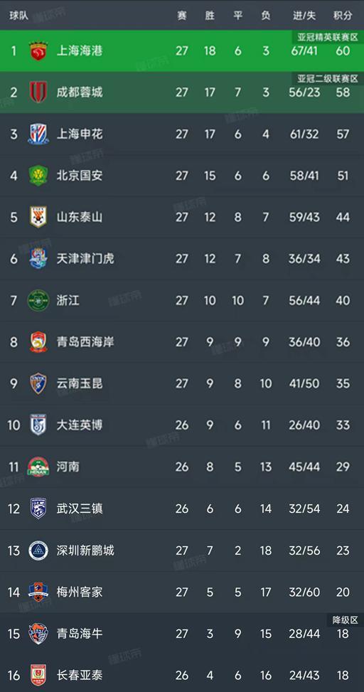 北京时间10月19日,中超联赛第27轮6场比赛结束。让我们来看看申明的最新变化吧!中超最新积分榜上争夺冠军的球队是上海海港、成都榕城和上海申花。国安昨晚1-2不敌深圳,冠军薄弱!本轮黑格凭借莱昂纳多的双进球以及李心翔、加布里埃尔的关键进球以4-3击败青岛海牛,开启4连胜。此前的比赛中,港队的防守并不好,连续4场比赛至少丢2球。好在进攻能力在线,尤其是莱昂纳多,4场比赛打进8球,是球队争冠的得分利器。着装方面考虑海港排第一。目前,海港领先成都2分,领先申花3分,拥有夺冠主动权。荣成击败梅州哈本轮kka以3-1领先,杨明阳、莱切特和洛穆洛分别建功。上海申花2-1逆转9人青岛西海岸,两名老将吴曦和于汉超。联赛只剩最后三轮了。让我们继续关注海港、成都、申花谁会迎头赶上,谁能夺冠!国安联赛冠军无望。北京国安上半场是冠军,但下半场继续疲软,再次浪费了良机。昨晚他们对阵保级球队深圳新鹏城。国安队的防守十分顽强,上半场他们就连续梅开二度。韦斯利和加西亚互传射门,张玉宁下半场只打进一球挽回颜面,最终1-2落败。目前国安积51分排名第4。进前三遇到障碍,暂时不会跌到第五。最本赛季对他们来说至关重要的比赛可能是足总杯决赛。与河南队的对决将决定他们本赛季的收成。深圳救命决赛赛程 深圳最为艰难,面对三支前四球队,但如今拿回国安,积分已升至23分,领先降级区5分。他们掌控着降级的命运。梅州客家输给诚诚后,仍积20分排名倒数第三。青岛海牛输给海港后,积18分排名倒数第二。垫底亚泰本轮的对手是河南队,他们需要一条命来救命!山东浙江战平山东泰山,浙江队客场2-2平。卡扎错失点球,黄征宇和克雷桑(点球)进球。协助浙江得分的是亚戈·卡雷罗和奥乌苏。山东泰山积44分暂列第五,浙江队排名第七第 n 名,40 分。天津金门虎两度不敌云南玉坤,0-2。奥斯卡点球破门,恩里克建功。天津以43分暂列第六,云南玉昆以35分排名第九。