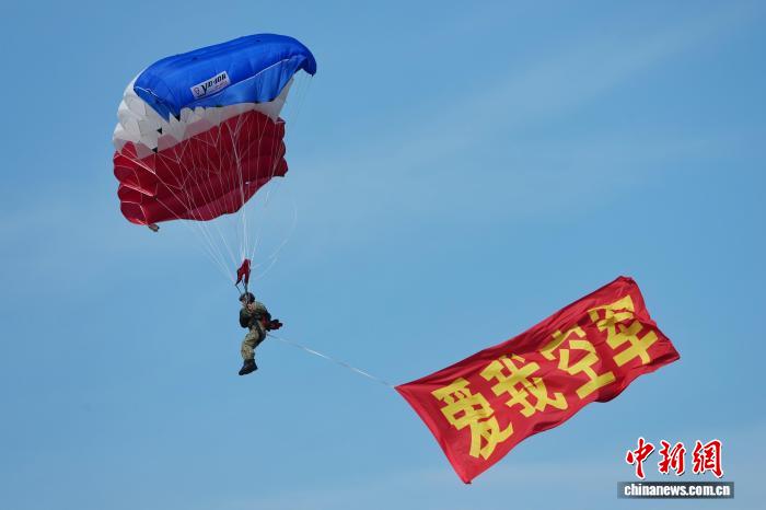 上午9点左右,有两个Y-12D接一个接一个,因此“ 8月1日1”和“蓝鹰”的降落伞队带着派对旗,国际旗帜,8月1日的军事旗帜以及空军的旗帜,并在高地开设了横幅和共同的旗帜。